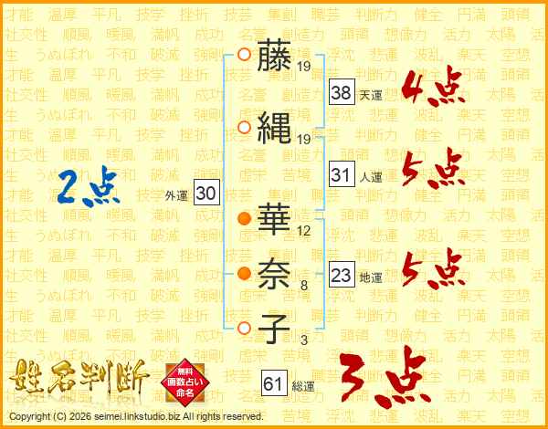 藤(19画)縄(19画) 華(12画)奈(8画)子(3画)