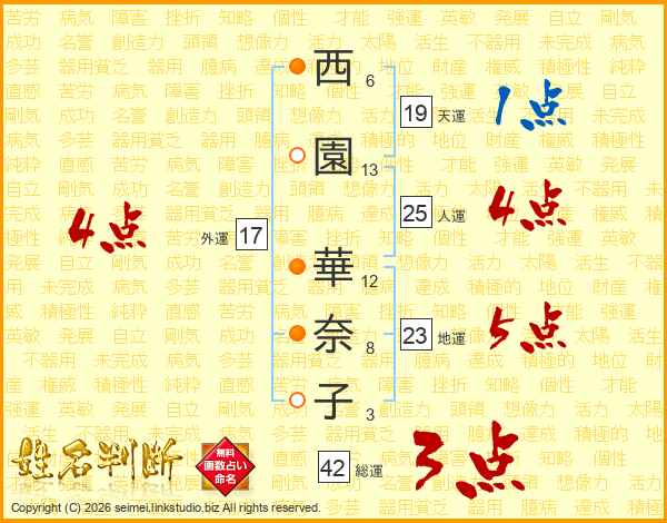 西(6画)園(13画) 華(12画)奈(8画)子(3画)