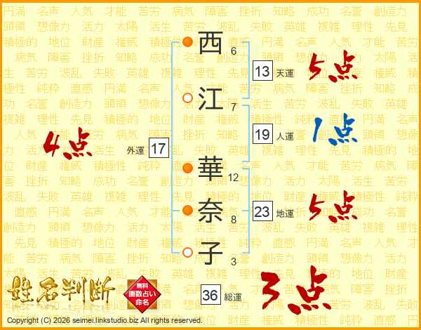 西(6画)江(7画) 華(12画)奈(8画)子(3画)