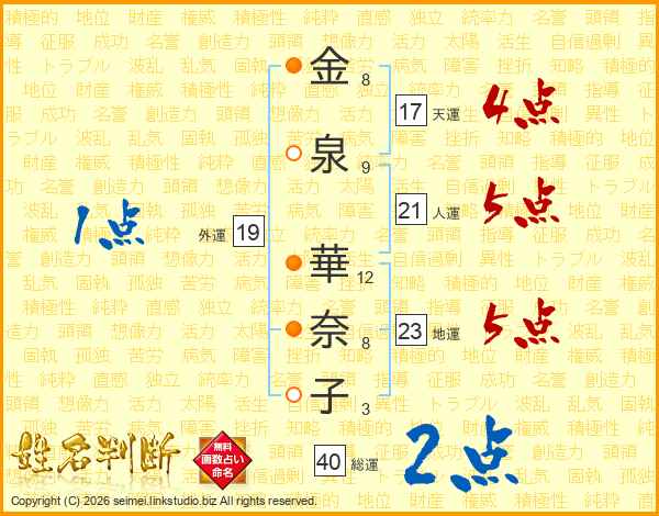 金(8画)泉(9画) 華(12画)奈(8画)子(3画)