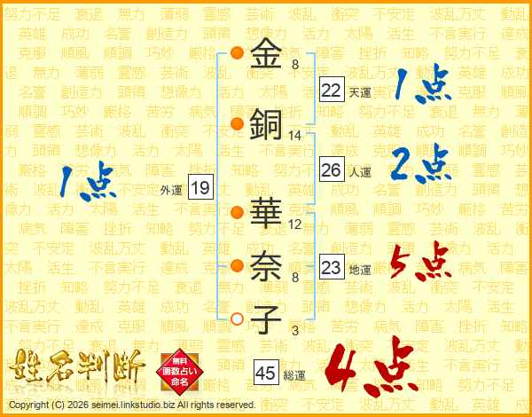 金(8画)銅(14画) 華(12画)奈(8画)子(3画)