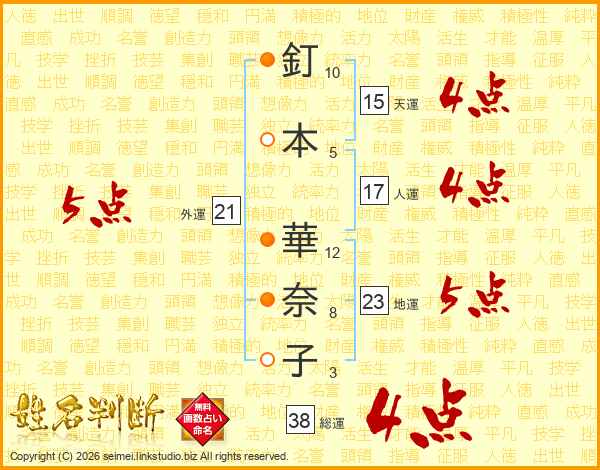 釘(10画)本(5画) 華(12画)奈(8画)子(3画)