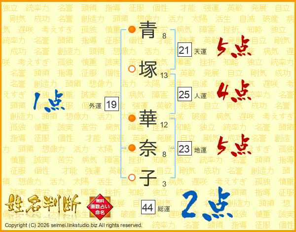 青(8画)塚(13画) 華(12画)奈(8画)子(3画)