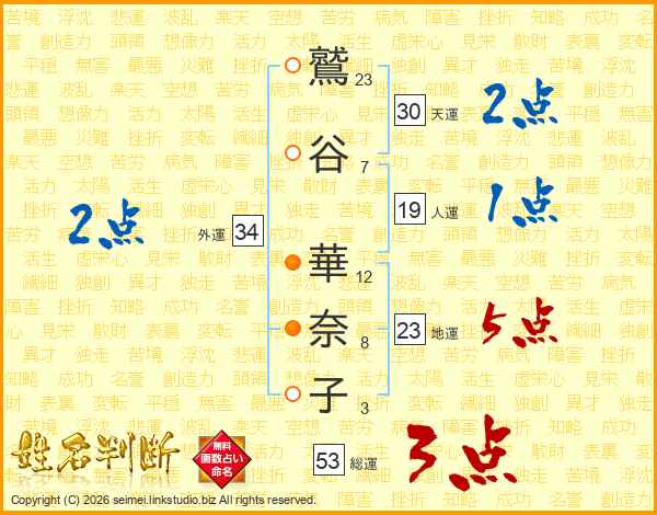 鷲(23画)谷(7画) 華(12画)奈(8画)子(3画)
