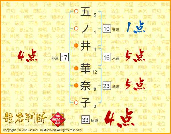 五(5画)ノ(1画)井(4画) 華(12画)奈(8画)子(3画)