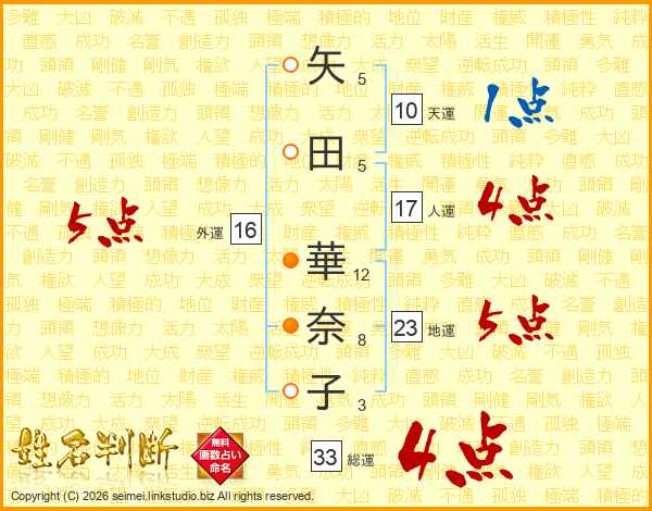 矢(5画)田(5画) 華(12画)奈(8画)子(3画)
