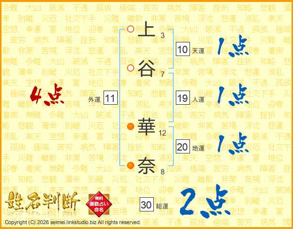 生活面を象徴する運勢です。外部から受ける影響力を表し、結婚運、家庭運や職場、環境への順応性を表します。総運から人運を引いた画数。姓や名が1文字の場合を除く。