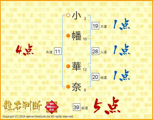 生活面を象徴する運勢です。外部から受ける影響力を表し、結婚運、家庭運や職場、環境への順応性を表します。総運から人運を引いた画数。姓や名が1文字の場合を除く。