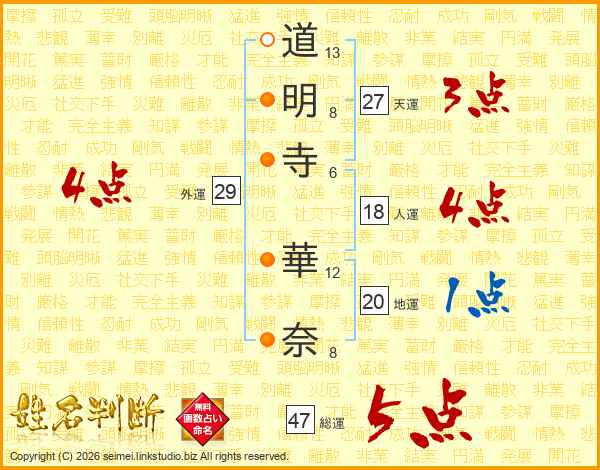 道(13画)明(8画)寺(6画) 華(12画)奈(8画)