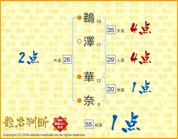 鵜(18画)澤(17画) 華(12画)奈(8画)