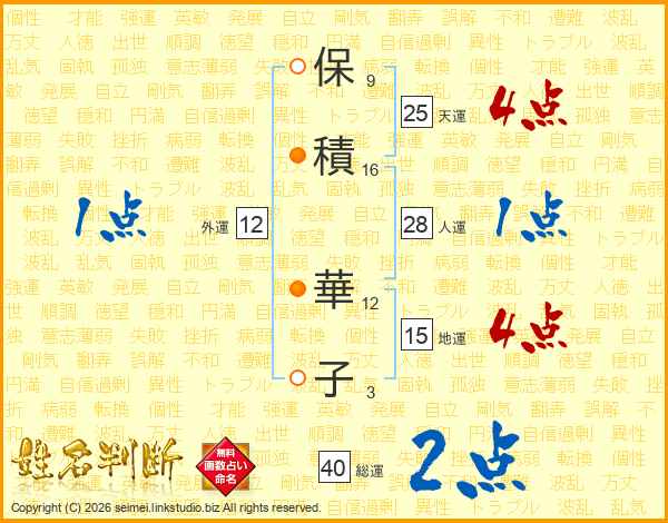 生活面を象徴する運勢です。外部から受ける影響力を表し、結婚運、家庭運や職場、環境への順応性を表します。総運から人運を引いた画数。姓や名が1文字の場合を除く。