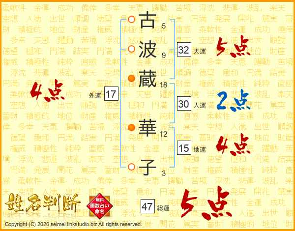 古(5画)波(9画)蔵(18画) 華(12画)子(3画)