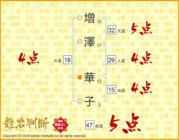 あなたの人生を表す1番重要な運勢です。生涯を通じて影響する総合運となり、主に50歳以降の晩年期に影響を及ぼします。苗字と名前の合計画数。