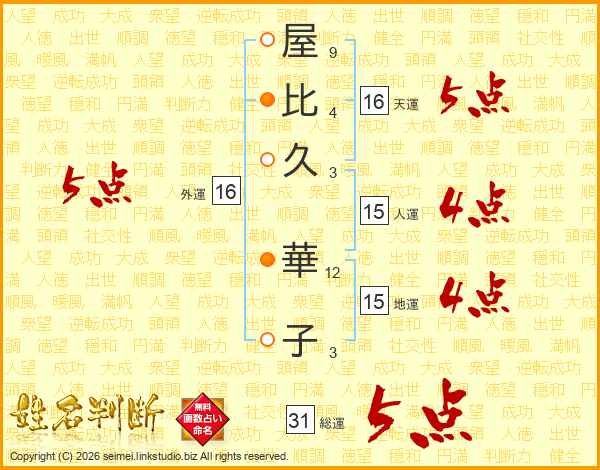 屋(9画)比(4画)久(3画) 華(12画)子(3画)
