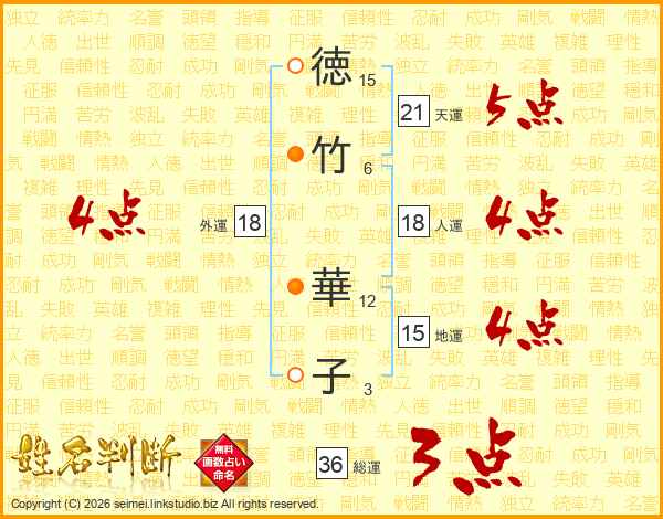 徳(15画)竹(6画) 華(12画)子(3画)