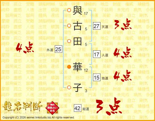 與(17画)古(5画)田(5画) 華(12画)子(3画)