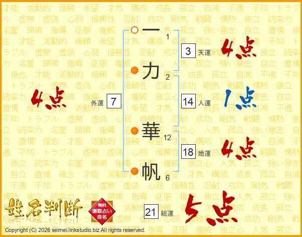 生活面を象徴する運勢です。外部から受ける影響力を表し、結婚運、家庭運や職場、環境への順応性を表します。総運から人運を引いた画数。姓や名が1文字の場合を除く。