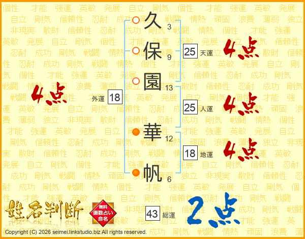 久(3画)保(9画)園(13画) 華(12画)帆(6画)