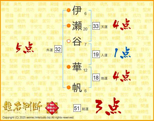 伊(6画)瀬(20画)谷(7画) 華(12画)帆(6画)