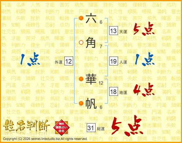 生活面を象徴する運勢です。外部から受ける影響力を表し、結婚運、家庭運や職場、環境への順応性を表します。総運から人運を引いた画数。姓や名が1文字の場合を除く。