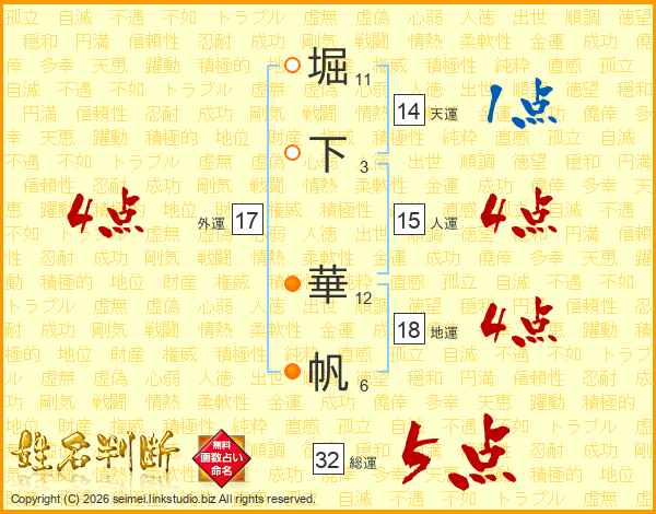 生活面を象徴する運勢です。外部から受ける影響力を表し、結婚運、家庭運や職場、環境への順応性を表します。総運から人運を引いた画数。姓や名が1文字の場合を除く。