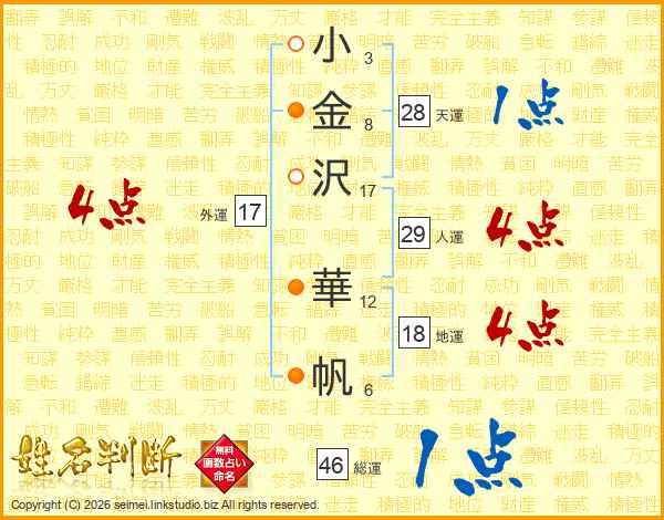 小(3画)金(8画)沢(17画) 華(12画)帆(6画)