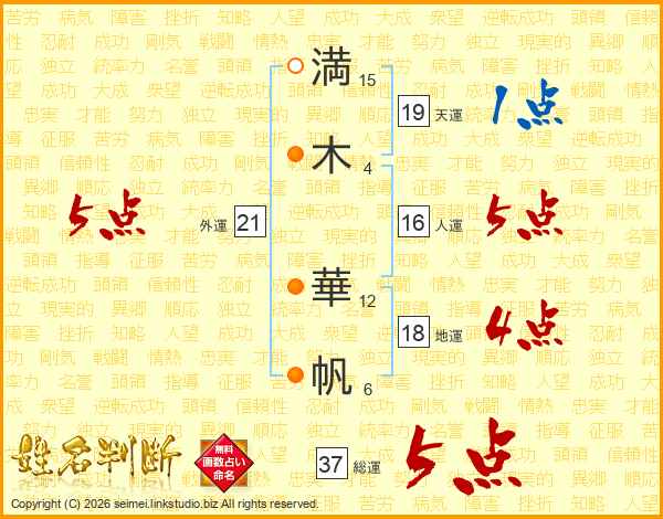 満(15画)木(4画) 華(12画)帆(6画)