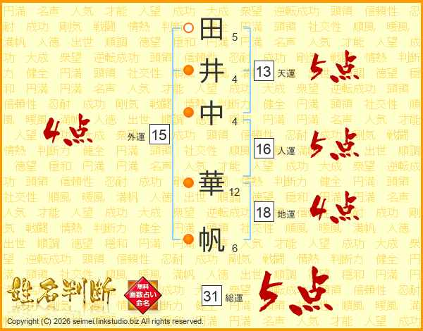 田(5画)井(4画)中(4画) 華(12画)帆(6画)