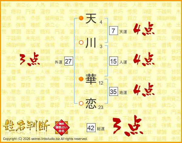 天(4画)川(3画) 華(12画)恋(23画)