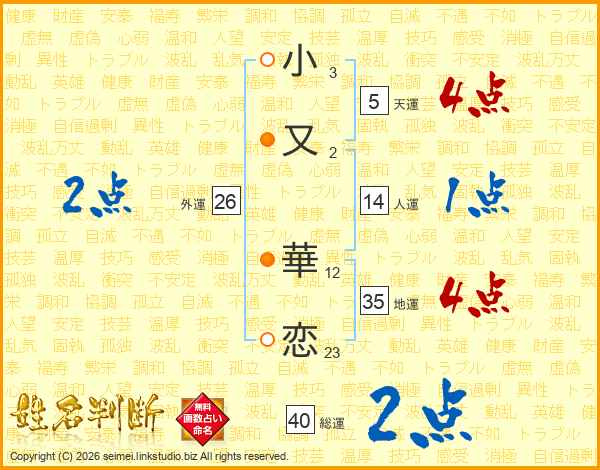 生活面を象徴する運勢です。外部から受ける影響力を表し、結婚運、家庭運や職場、環境への順応性を表します。総運から人運を引いた画数。姓や名が1文字の場合を除く。