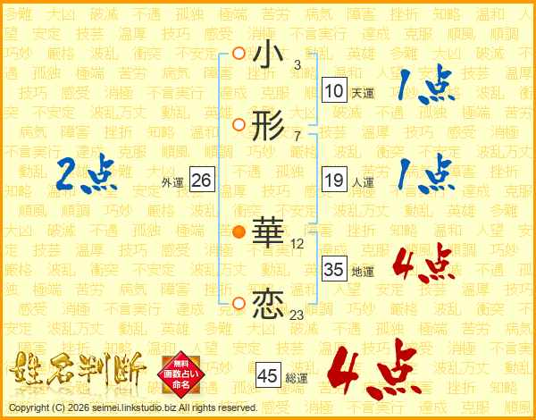 生活面を象徴する運勢です。外部から受ける影響力を表し、結婚運、家庭運や職場、環境への順応性を表します。総運から人運を引いた画数。姓や名が1文字の場合を除く。