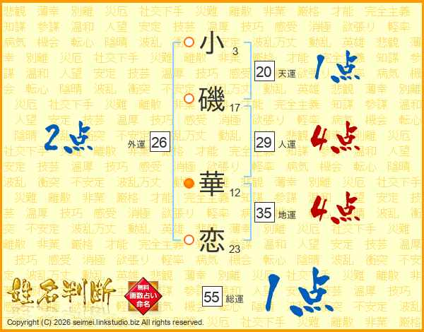 生活面を象徴する運勢です。外部から受ける影響力を表し、結婚運、家庭運や職場、環境への順応性を表します。総運から人運を引いた画数。姓や名が1文字の場合を除く。