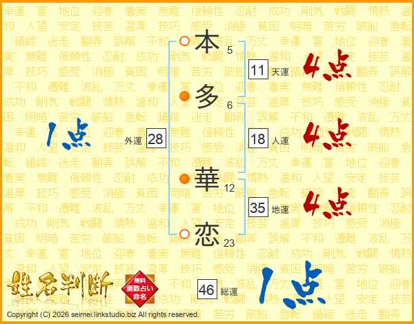 生活面を象徴する運勢です。外部から受ける影響力を表し、結婚運、家庭運や職場、環境への順応性を表します。総運から人運を引いた画数。姓や名が1文字の場合を除く。