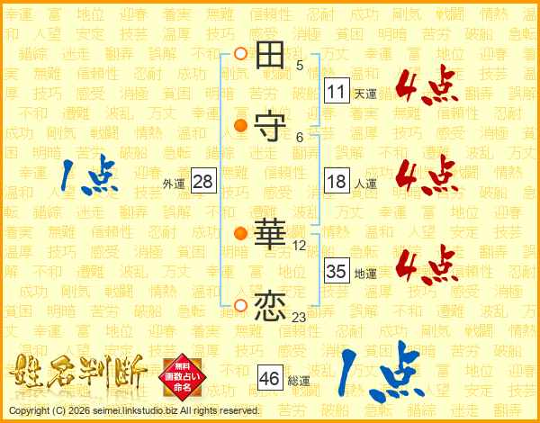 田(5画)守(6画) 華(12画)恋(23画)