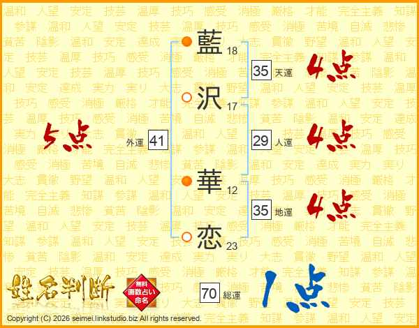藍(18画)沢(17画) 華(12画)恋(23画)