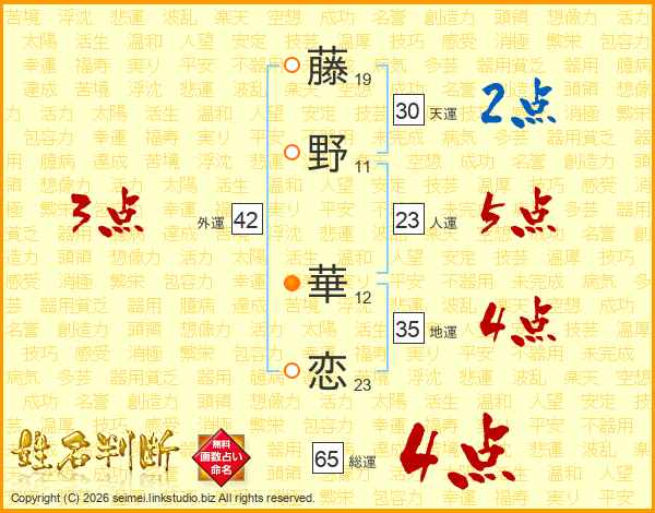 生活面を象徴する運勢です。外部から受ける影響力を表し、結婚運、家庭運や職場、環境への順応性を表します。総運から人運を引いた画数。姓や名が1文字の場合を除く。