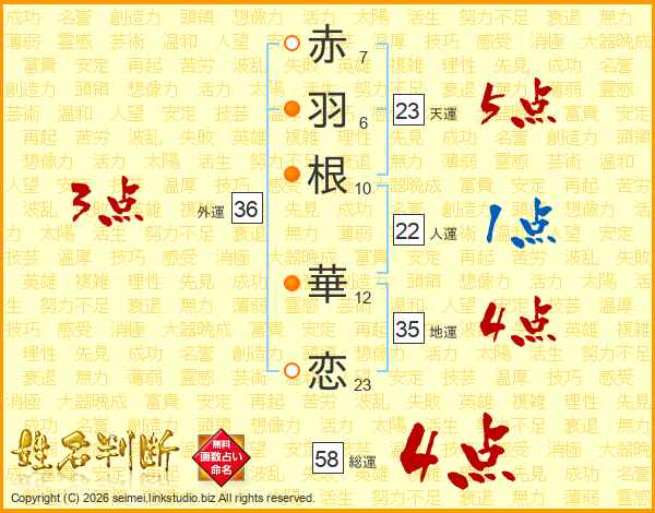 赤(7画)羽(6画)根(10画) 華(12画)恋(23画)