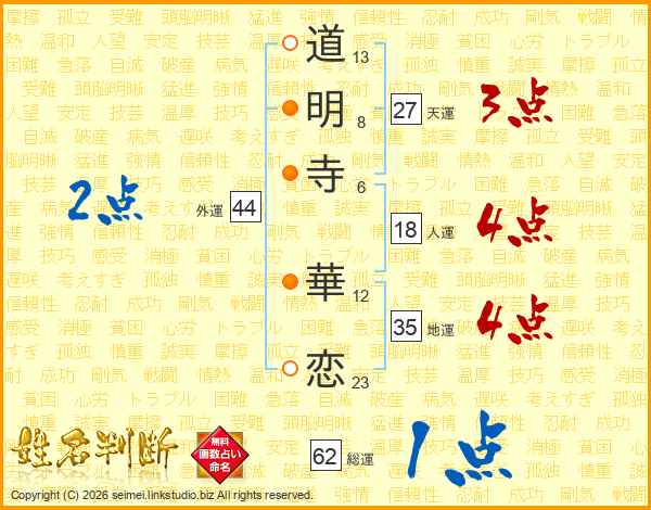 道(13画)明(8画)寺(6画) 華(12画)恋(23画)