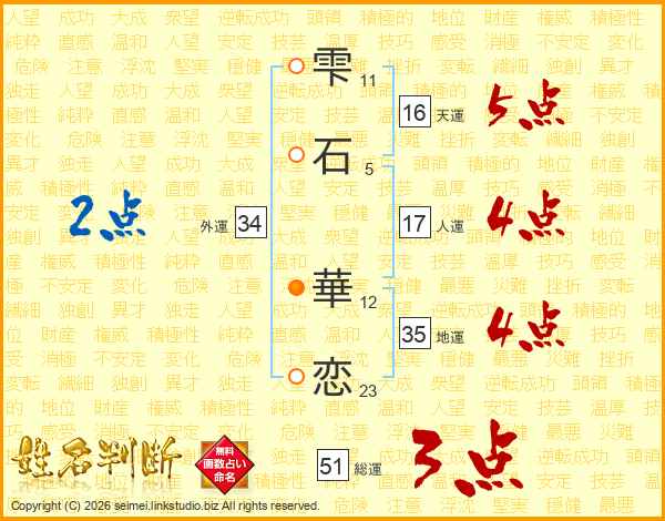 雫(11画)石(5画) 華(12画)恋(23画)