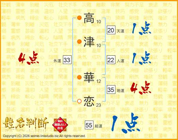 生活面を象徴する運勢です。外部から受ける影響力を表し、結婚運、家庭運や職場、環境への順応性を表します。総運から人運を引いた画数。姓や名が1文字の場合を除く。