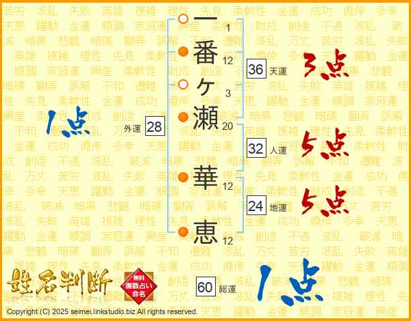 一(1画)番(12画)ヶ(3画)瀬(20画) 華(12画)恵(12画)