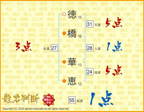 徳(15画)橋(16画) 華(12画)恵(12画)