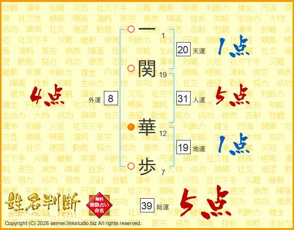 生活面を象徴する運勢です。外部から受ける影響力を表し、結婚運、家庭運や職場、環境への順応性を表します。総運から人運を引いた画数。姓や名が1文字の場合を除く。