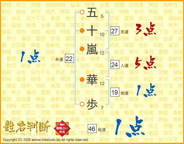 五(5画)十(10画)嵐(12画) 華(12画)歩(7画)