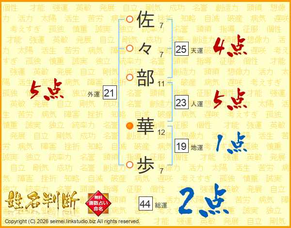 佐(7画)々(7画)部(11画) 華(12画)歩(7画)