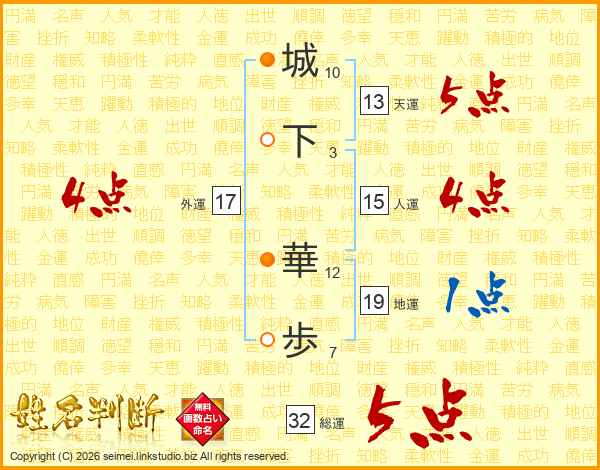 生活面を象徴する運勢です。外部から受ける影響力を表し、結婚運、家庭運や職場、環境への順応性を表します。総運から人運を引いた画数。姓や名が1文字の場合を除く。