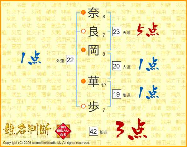奈(8画)良(7画)岡(8画) 華(12画)歩(7画)
