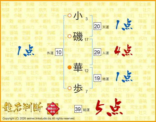 生活面を象徴する運勢です。外部から受ける影響力を表し、結婚運、家庭運や職場、環境への順応性を表します。総運から人運を引いた画数。姓や名が1文字の場合を除く。
