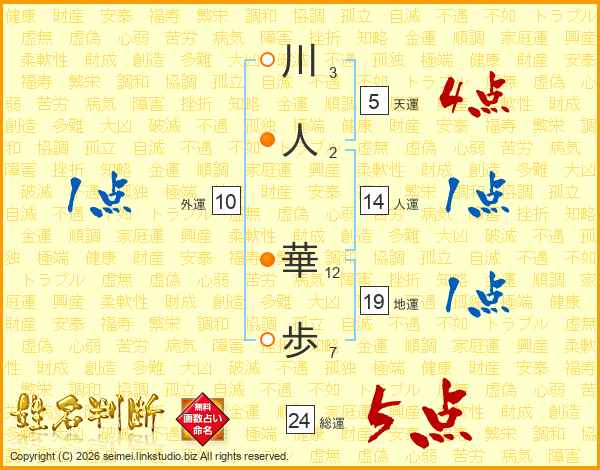 生活面を象徴する運勢です。外部から受ける影響力を表し、結婚運、家庭運や職場、環境への順応性を表します。総運から人運を引いた画数。姓や名が1文字の場合を除く。