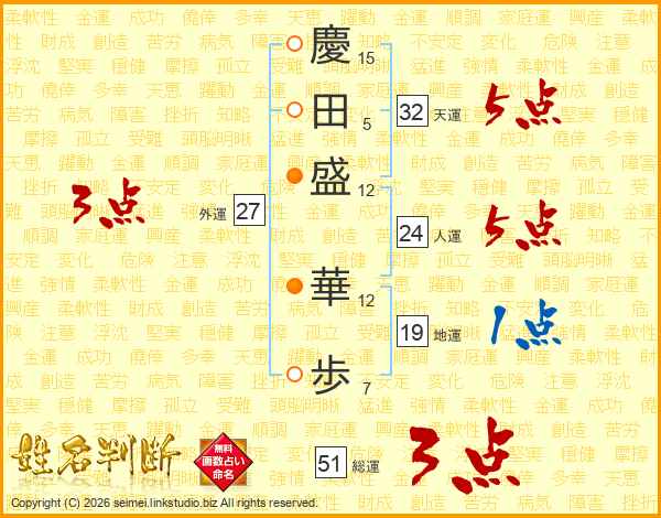 慶(15画)田(5画)盛(12画) 華(12画)歩(7画)